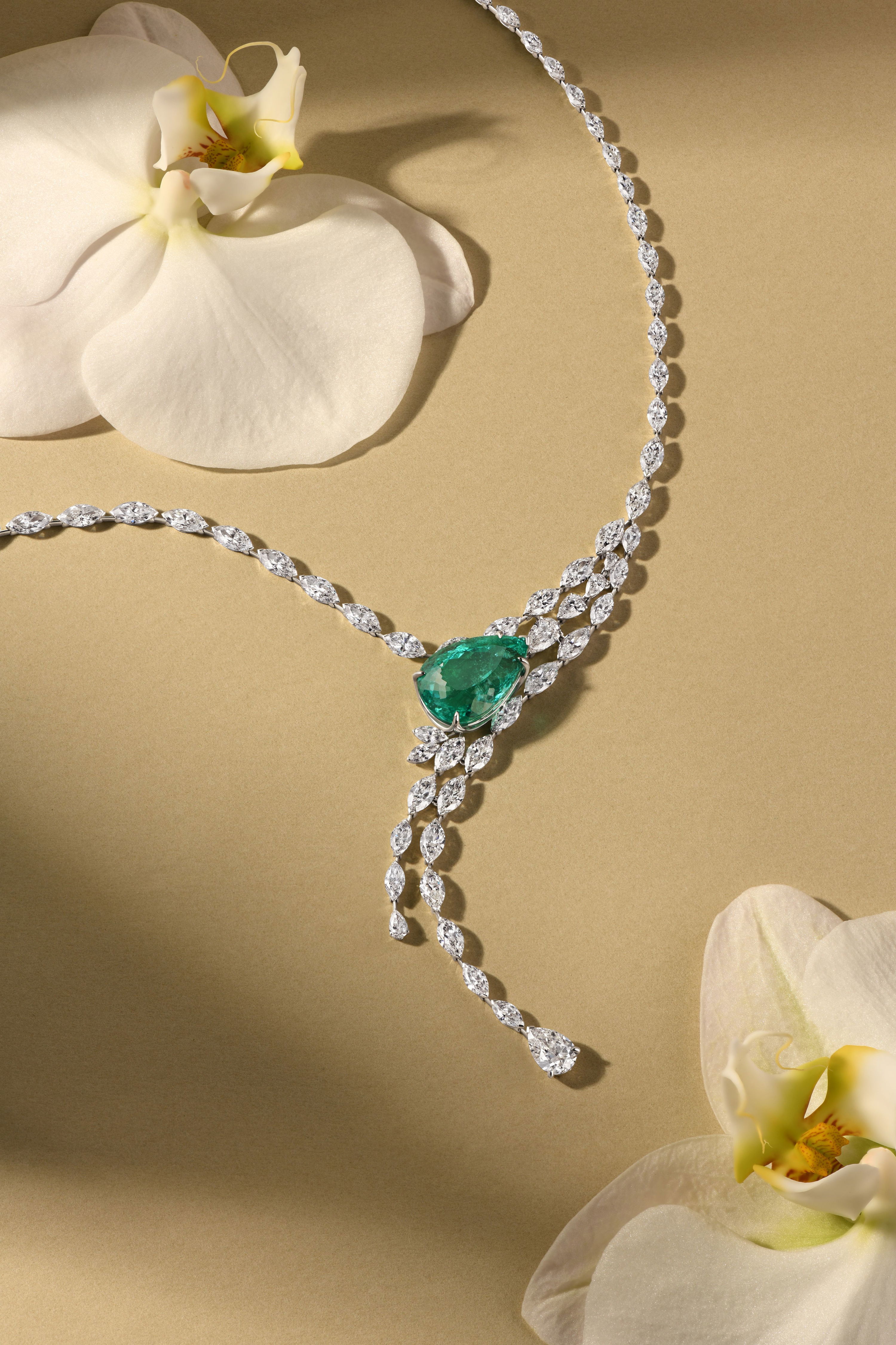 Ювелирам Parure Atelier удалось вписать впечатляющий камень в изящный, лёгкий, как морской бриз, дизайн. Турмалин словно увлечён сверкающим потоком бриллиантов и устремляется вверх, преодолевая законы физики. Для достижения эффекта потребовалось 67 камней огранки «маркиз» и восемь «груш» общим весом 27,03 карата. Но украшение нельзя назвать громоздким — на самом деле оно не тяжелее 30 грамм.