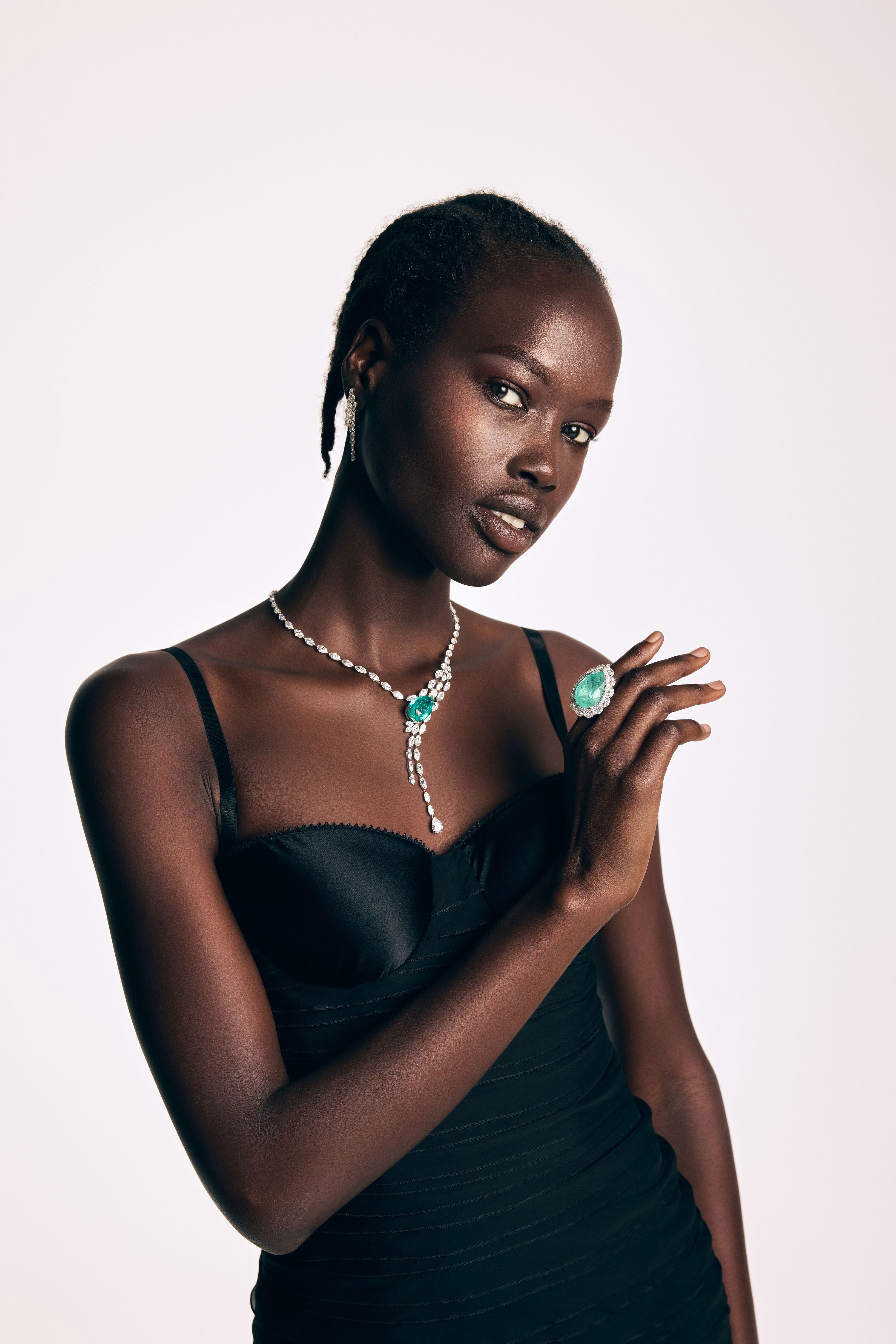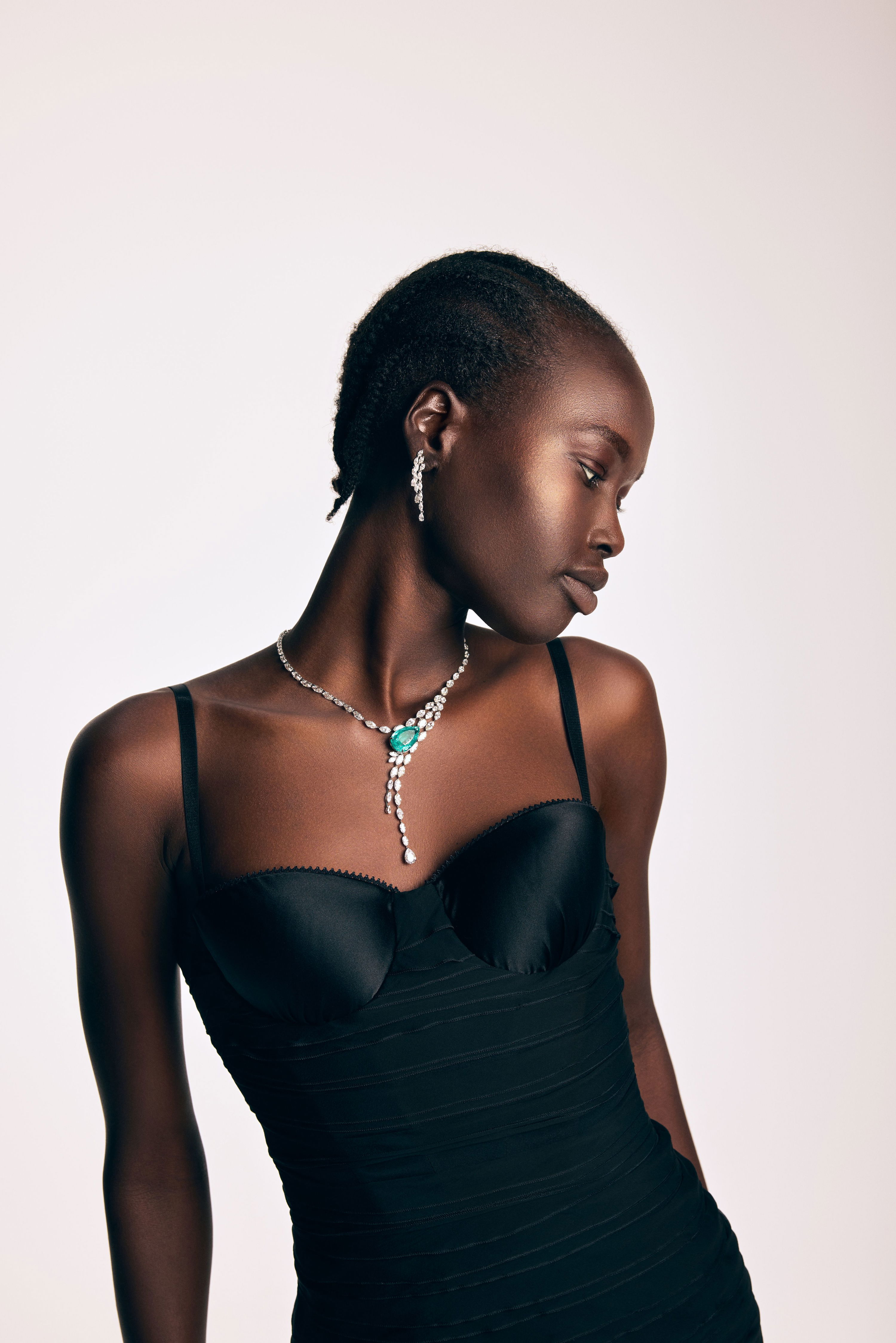 Центральный камень добыт в Мозамбике — одном из немногих мест на земле, где ещё можно встретить медьсодержащие турмалины. Чем ярче оттенок, тем выше ценится камень, и в колье Lagoon, безусловно, сверкает на удивление удачный экземпляр.
