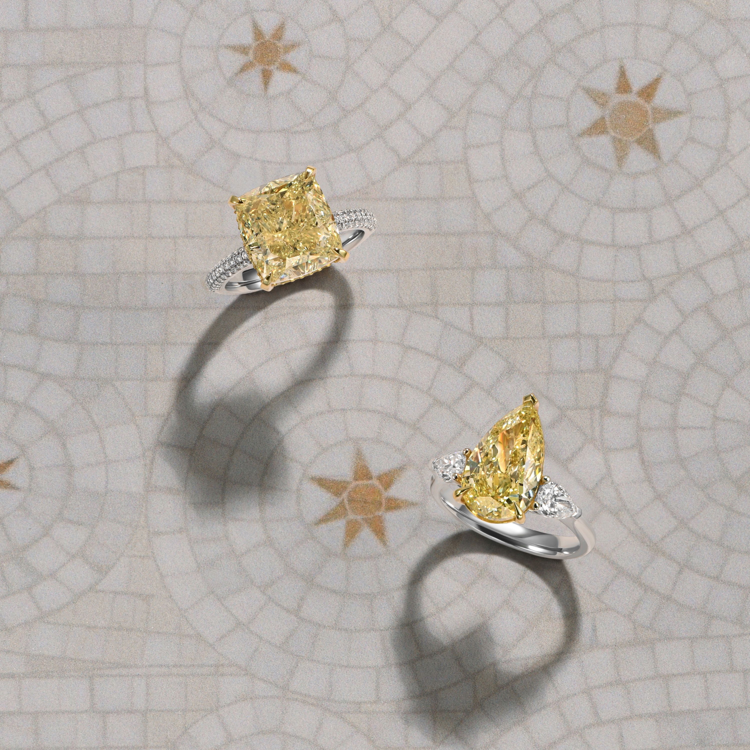 Кольцо с желтым бриллиантом 4.14 карата привлекает внимание своим выразительным дизайном и тщательно продуманной композицией. Центральный камень — желтый бриллиант весом 4.14 карата — выполнен в форме капли, что подчеркивает его уникальную игру света и цветовую глубину. По обеим сторонам от основного камня расположены два бриллианта классической огранки, которые создают гармоничный контраст и усиливают сияние центрального элемента. Изделие выполнено из белого золота, что придает украшению современный и лаконичный вид, а также выгодно подчеркивает насыщенный оттенок желтого бриллианта.